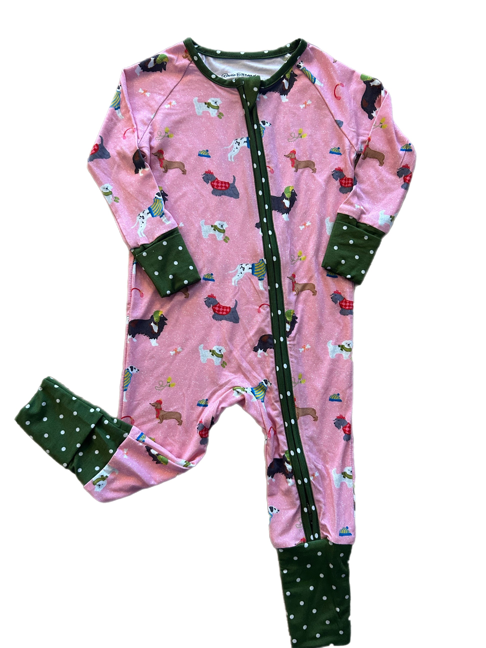 Our Snuggle Pups zippy features cozy dogs in their winter best on a soft pink background with cheerful green polka dot trim. Thoughtfully designed with fold-over hands and feet and a double zipper for easy changes, it’s as practical as it is adorable. Made from luxury modal fabric (92% Modal 8% Spandex) these buttery soft, breathable pajamas are perfect for the holiday season and beyond. This exclusive print is one of a kind and fits true to size (we recommend sizing up if between sizes).